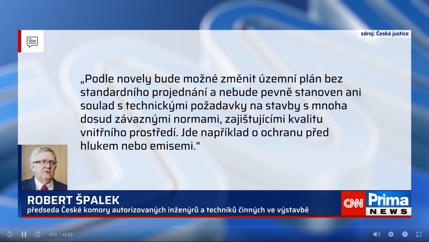 …Robert ŠPALEK, předseda ČKAIT: Podle novely bude možné změnit územní plán bez standardního projednání a nebude pevně stanoven ani souhlas technickými požadavky na stavby s mnoha dosud závaznými normami zajišťujícími kvalitu vnitřního prostředí. Jde například o ochranu před hlukem nebo emisemi…
